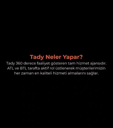 Tady, reklam sektöründe uzun yıllar biriktirdiği deneyimleri, taze ve yaratıcı bir perspektifle birleştirmiştir. Farklı disiplinlerden gelen profesyonellerden oluşan ekibimiz, reklamcılık, tasarım, pazarlama ve etkinlik organizasyonu gibi alanlarda geniş bir bilgi yelpazesine sahiptir.